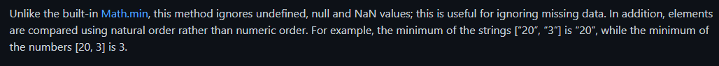 console.log(max);max()和min()大同小異,這邊不多述,另外值得一提的地方官方文件內有提到不像Math.min,如果資料當中有一些null或者underfined和NaN的時候將會自動忽略,這對資料遺失時候的情況十分有用。