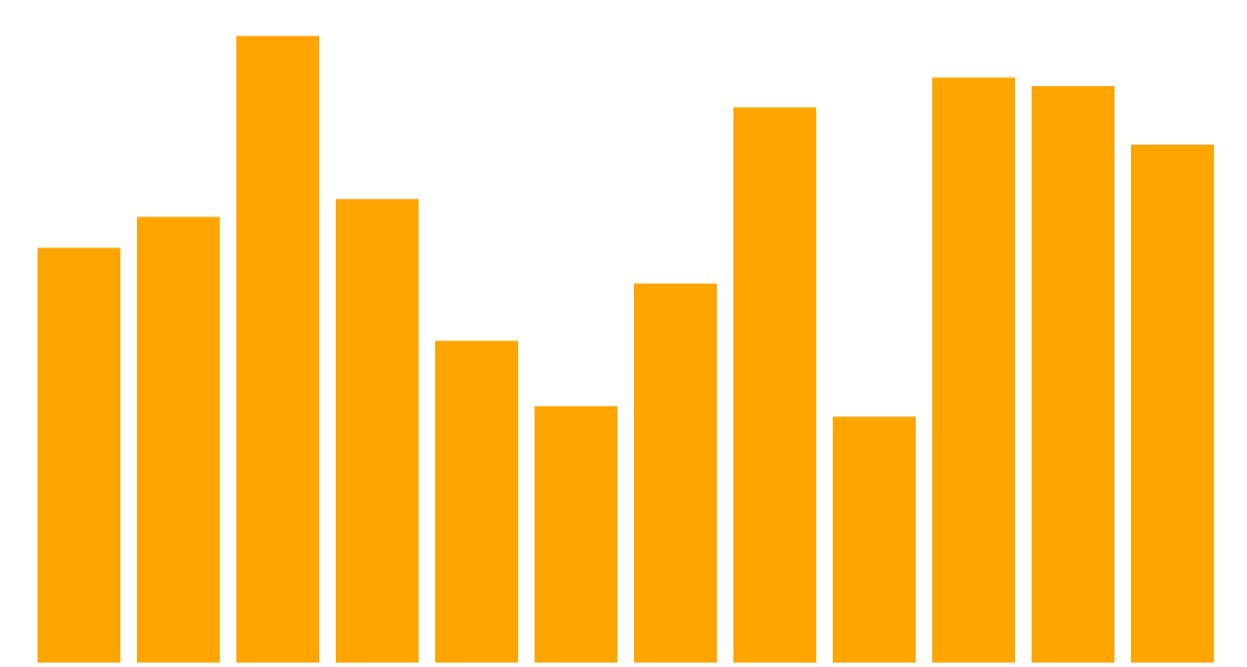 我們將資料放入rect當中之後的x起始點先加入padding往右移,然後根據索引值再繪製出每個rect長方形的時候再向右移60來當作起始點,而y的部分使用剛剛所做的scaleY()函式來進行資料的轉換,轉換的數值設為y的起始點,接下來寬設定50,x當時是根據索引值i設置60當起始點,而長方形的寬是設置50所以他們之間的間距自然而然就是60-50=10,最後再渲染出高的時候是使用400-scaleY(d.people_total),因為剛剛的scaleY的range()起始是400結束點是0所以原先的資料越大轉換之後的數字越小,所以使用400減去它,自然而然就可以表示原始資料所對應的大小了,最後我們填充橘色作為這個長條圖的顏色。
