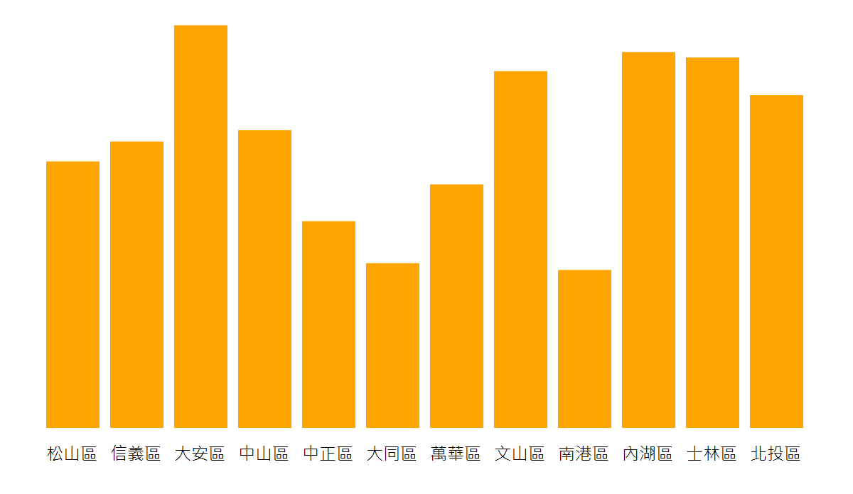 最後一個then處理人口密度、人口總數、鄉鎮市的面積,由於原始資料的內容是字串,這邊使用Number()將它轉型成數字site_id資料內容是臺北市大安區、臺北市士林區,每筆資料內容都包含了"臺北市",因此希望能夠簡化它,所以將取第四個字開始,長條圖的bar預計留50給之後要放各個區文字的空間,因此先padding設定50