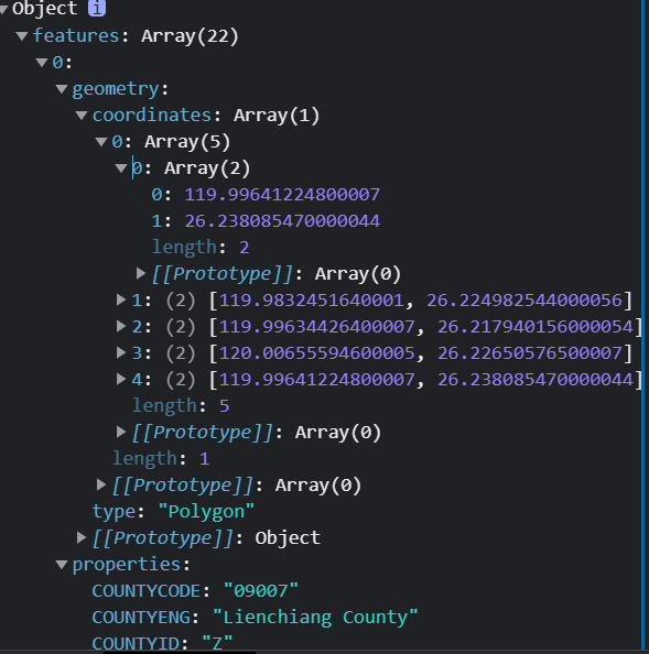 如上圖,properties儲存的東西是一些資訊例如縣市名稱、縣市代號等等,coordinate儲存的是經緯度這些座標點。