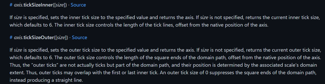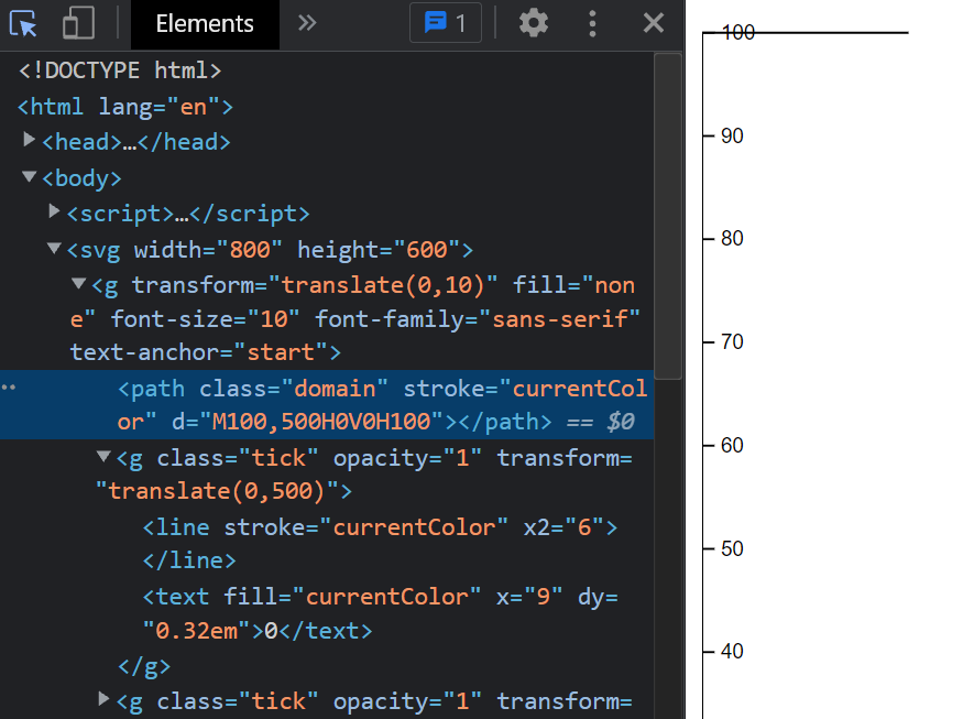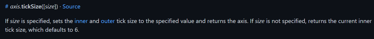 這邊可以發現tickSizeInner()改變的數值是class為tick的g元素裡面的<line>,而tickSizeOuter()改變的數值是最上面的<path>元素裡面的屬性d。最後我們嘗試改用tickSize()試試看就可以發現他將會改變<path>和<line>
