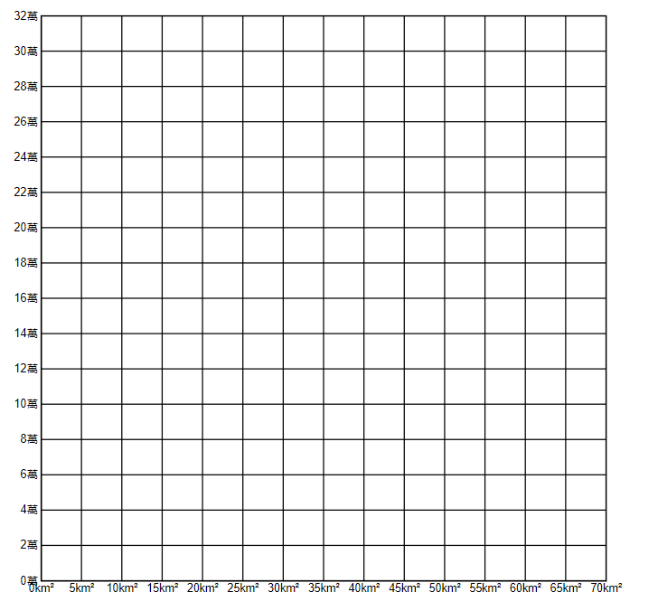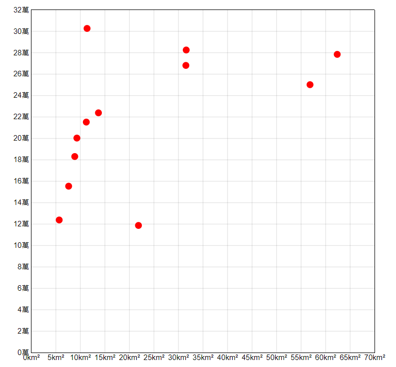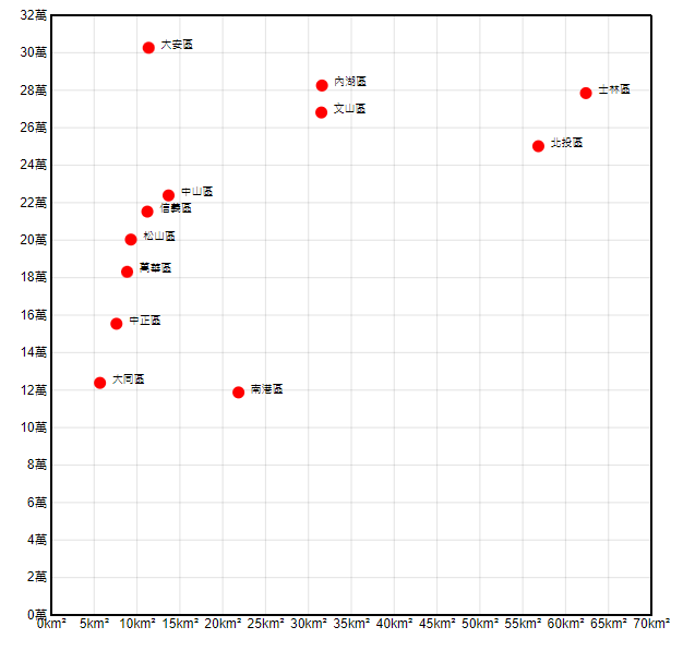 先前使用長條圖來表示各個行政區的人口數,散佈圖則適合做兩個變數以上的關係性,如果呈現的狀況聚集的點像是在一直線上的話,表示可能帶有正相關或是負相關,這次我們使用d3JS來繪製散佈圖,X軸表示平方公里、Y軸表示人口數,